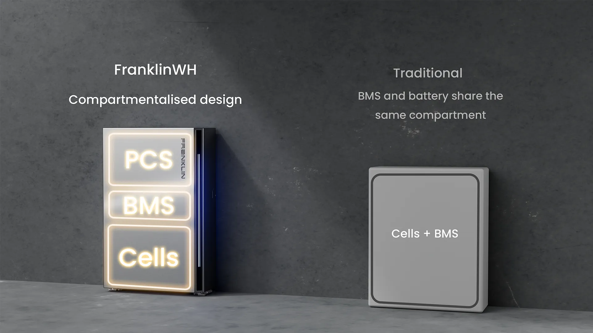 FranklinWH separates the battery cells, BMS, and the power conversion system (PCS) into different compartments, reducing the chance that a problem in one area affects the others. High-temperature insulating materials such as mica, silicone, and epoxy are also used to protect the BMS electronics.