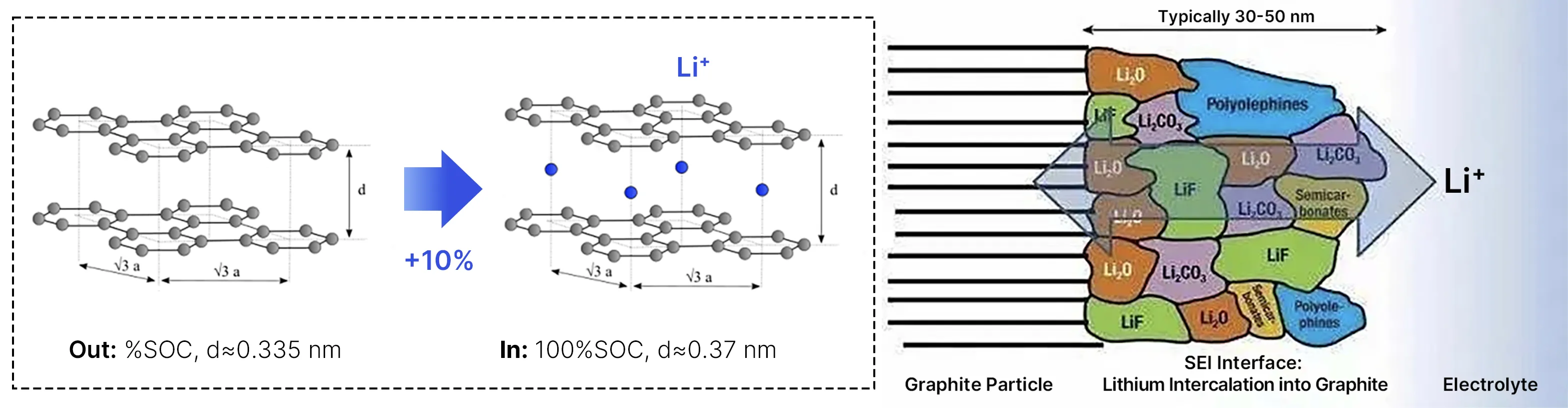 - Irreversible Mechanical Effects from Side Reactions: Inside an LFP cell, a thin protective film called the solid electrolyte interphase (SEI) forms on the anode surface during initial use, preventing further anode electrolyte reactions that generate unwanted by-products. Over many charge-discharge cycles, this film continues to grow and accumulate reaction products, becoming thicker and thicker. Because the layer does not shrink, this contributes to an increase in the battery’s thickness over time, just like wrapping extra layers of paper around a book makes it thicker.