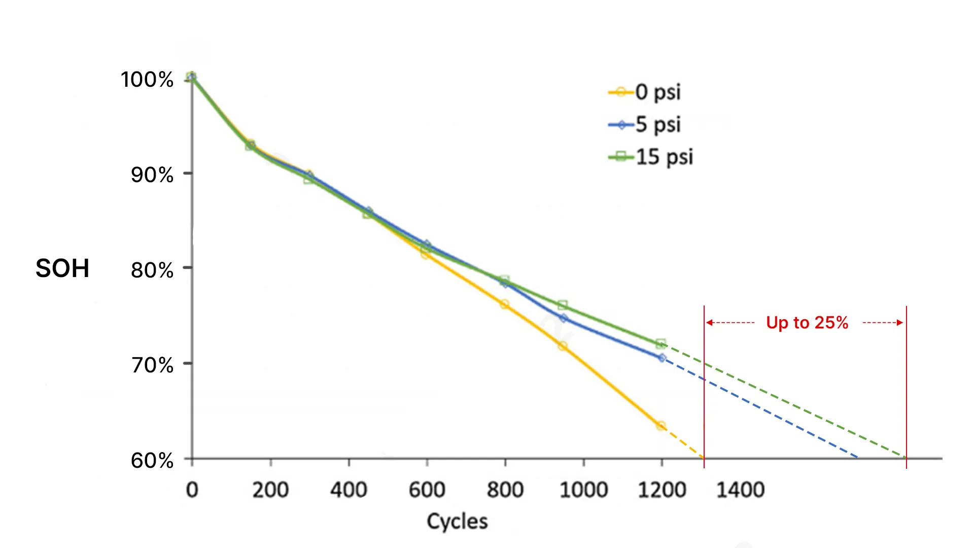 Preload control is not a one-time adjustment increasing clamping force. The pack must maintain the proper mechanical pressure consistently throughout a battery’s long lifetime, with tens of thousands of charge/discharge cycles over many years. The optimal pressure is not a fixed number and evolves with use as it dynamically interacts with temperature, state of charge (SOC), and cell ageing.