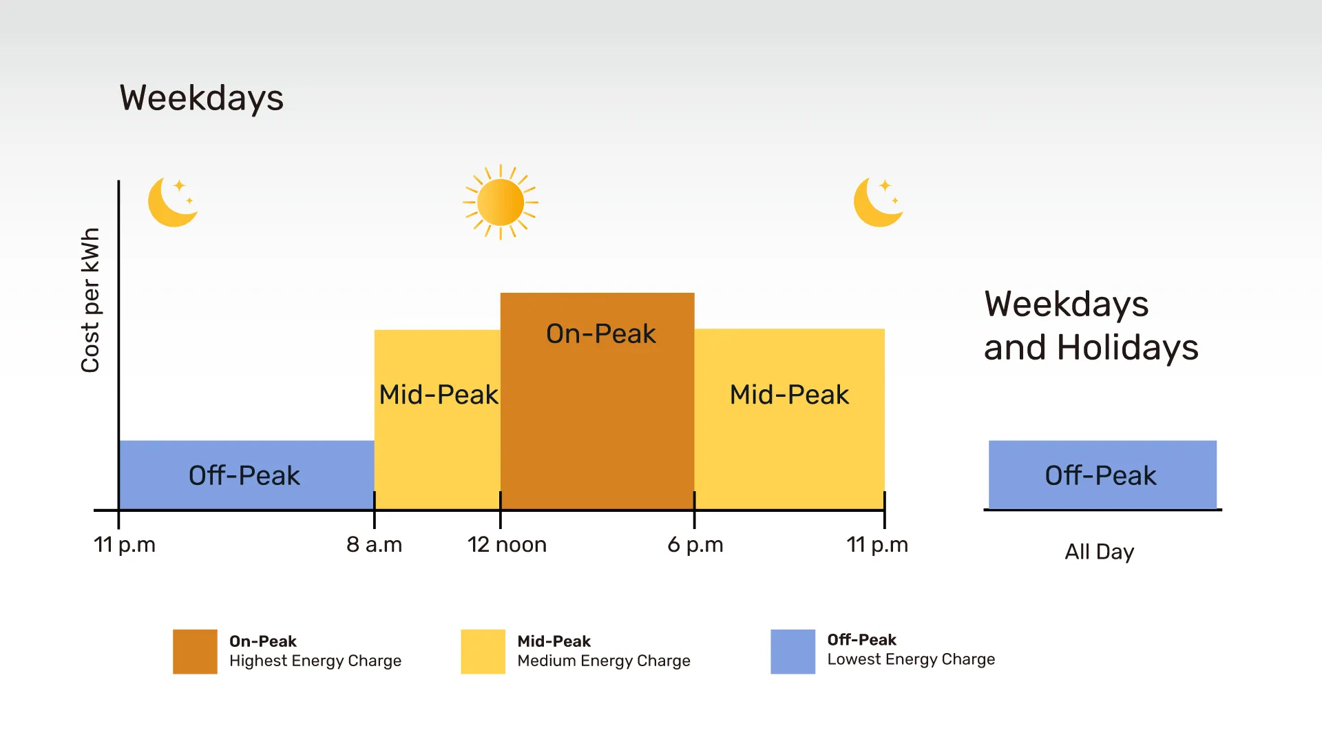Once you confirm your utility’s peak hours, it’s time to get strategic and start saving money. Note: many TOU plans also include “shoulder hours,” which are mid-price periods that fall between peak and off-peak times.