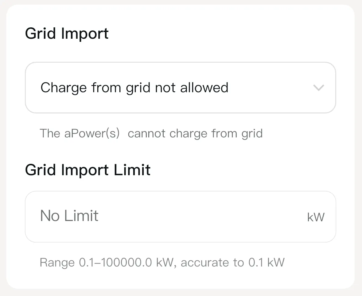 Grid Import: Default is Charge from grid not allowed. Enable when you're allowed to charge from the grid. The aGate will use the grid to charge the batteries in Time of Use mode during off-peak or super-off-peak periods. When disabled, the aPowers will only be charged from solar.