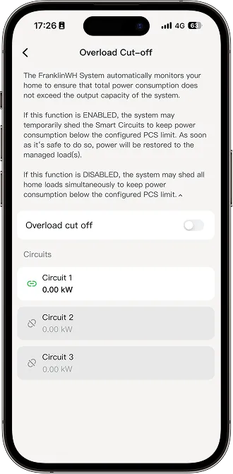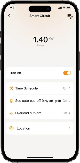 SOC Auto Cut-off (only off-grid): Extend backup hours by automatically disconnecting circuits in sequence based on battery SOC during a grid outage.