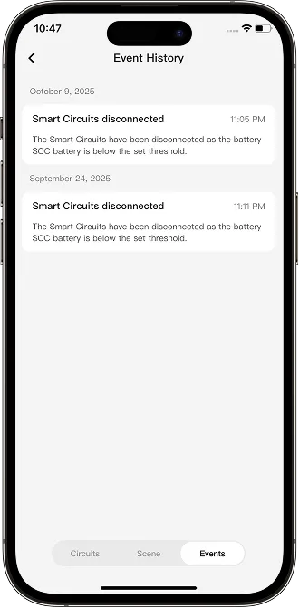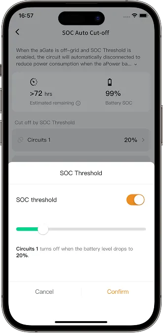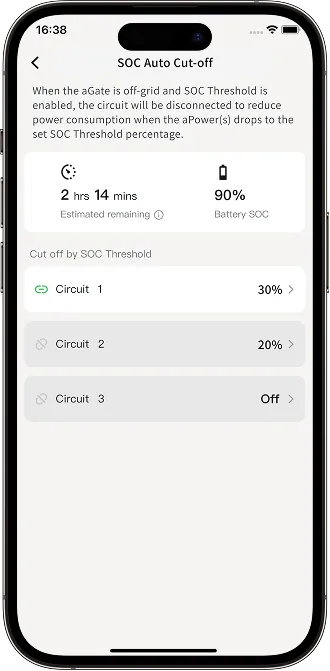 When the aPower battery capacity drops to the set SOC Threshold, each Smart Circuit will be automatically disconnected to reduce power consumption.