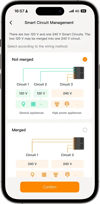 Merge circuits: If Smart Circuit 1 and Smart Circuit 2 share the same 2-pole switch, select the appropriate option to merge them, and then tap Confirm.