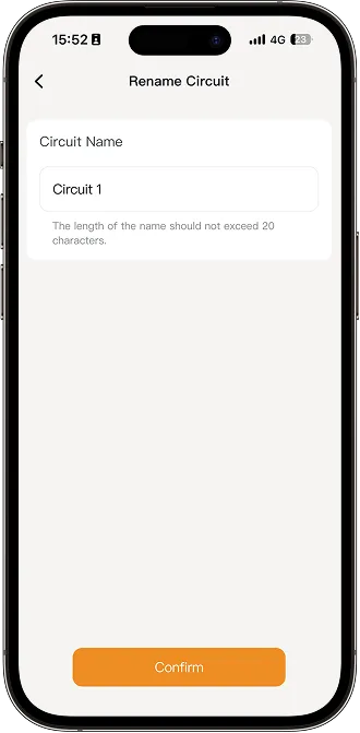 Name: Tap the Edit button on the top right, then tap Name to rename the circuit. Each circuit name may be up to 20 characters.