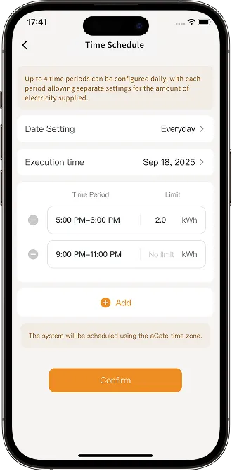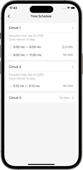 Time Schedule: Customize the time period or electricity consumption to automatically turn the circuit on or off.