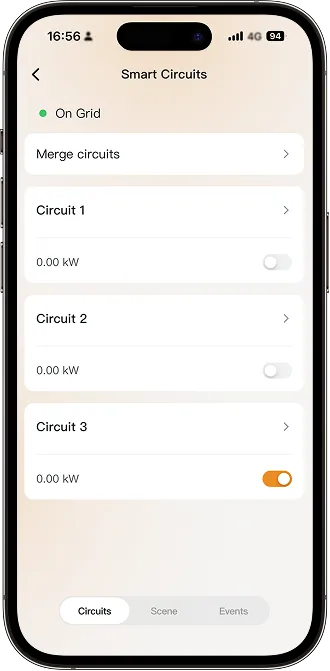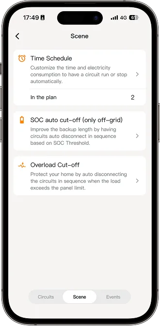 Tap the Scene tab to view the full list of available scenes. You can also set the Time Schedule, SOC Auto Cut-off (only off-grid), and Overload Cut-off scenes for the circuit.